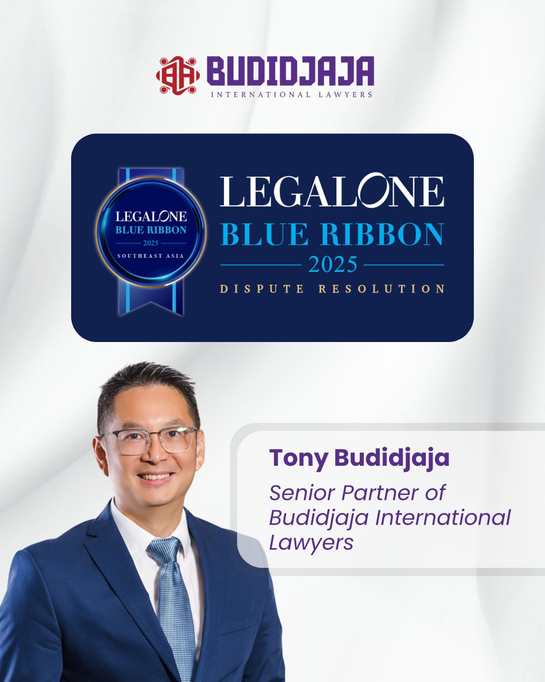 We are proud to share that Tony Budidjaja, Senior Partner of Budidjaja International Lawyers, has been recognized in the LegalOne Blue Ribbon 2025 – Southeast Asia (Dispute Resolution) category.