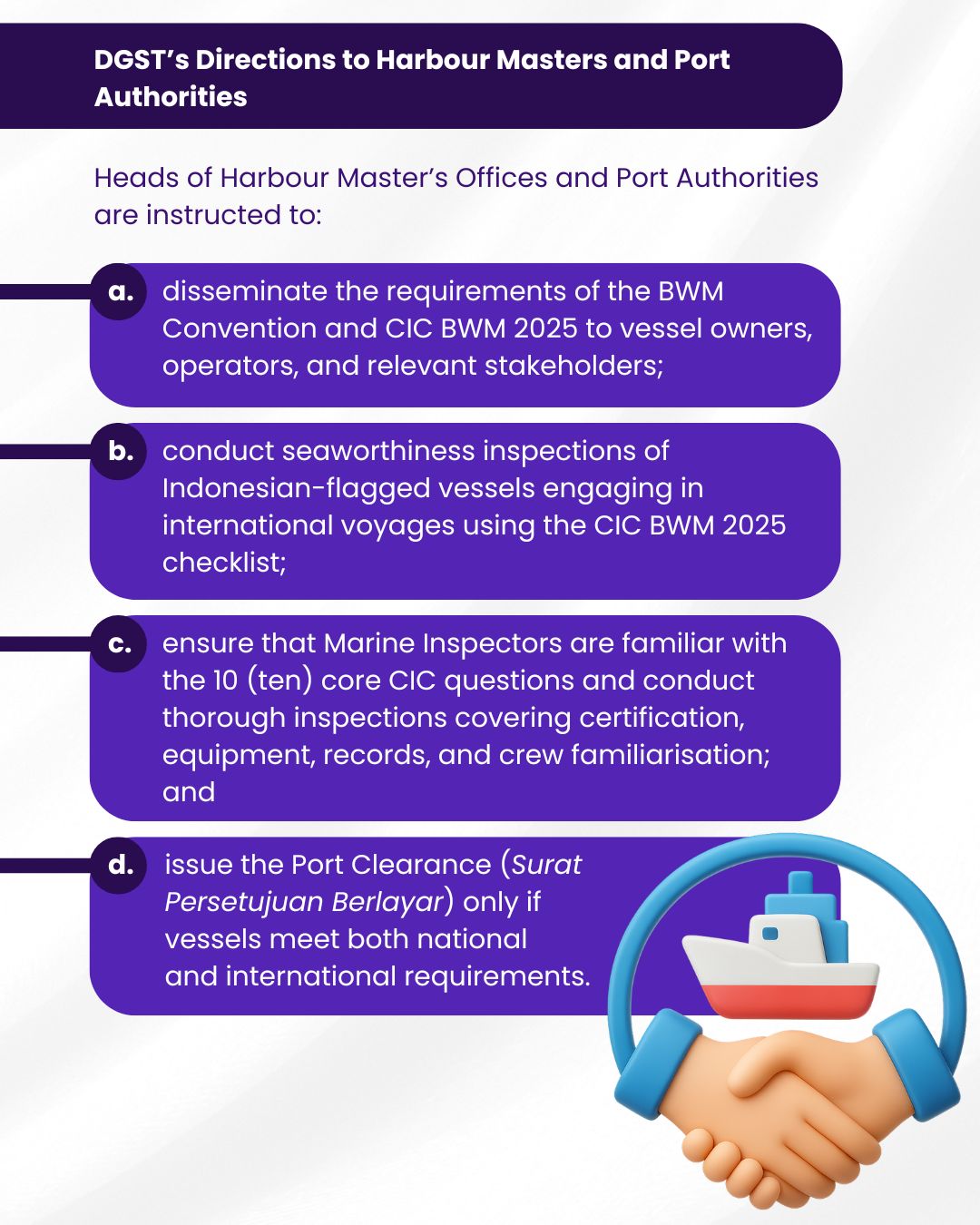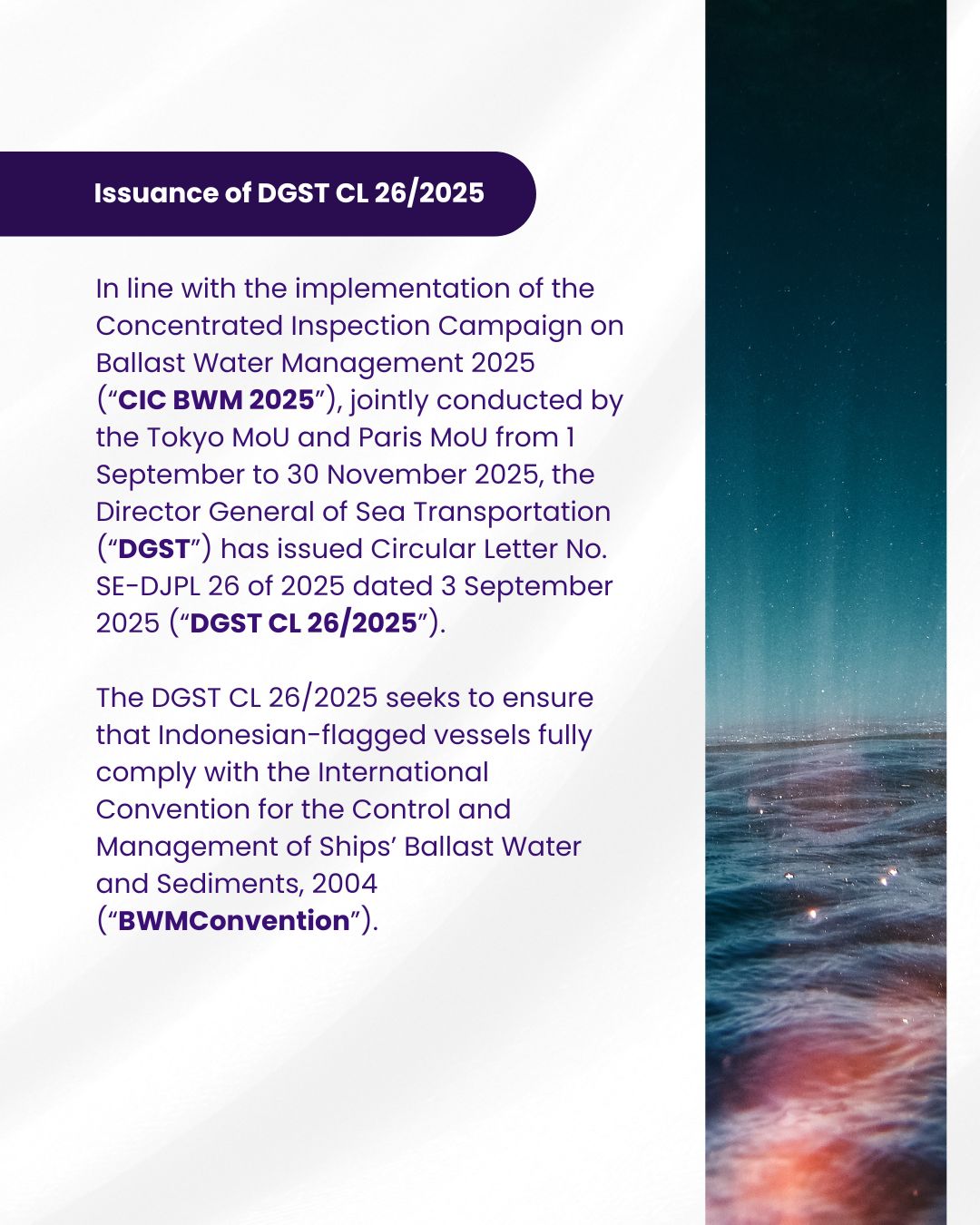 In this #BILLawFact, our Partner Eddy Isworo and Associate Qandyas Wahyu Sabila discuss the issuance of DGST Circular Letter No. SE-DJPL 26 of 2025, which outlines Indonesia’s preparation for the upcoming Concentrated Inspection Campaign (CIC) on Ballast Water Management 2025 jointly conducted by the Tokyo MoU and Paris MoU.