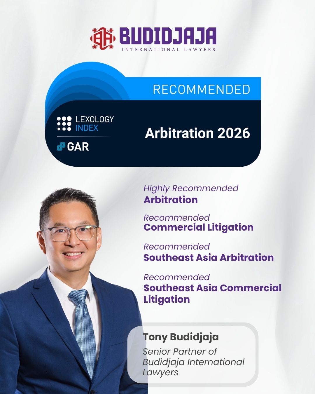 We are pleased to announce that Tony Budidjaja, Senior Partner of Budidjaja International Lawyers, has been recognized in the Lexology GAR Index 2026 across multiple key categories:
